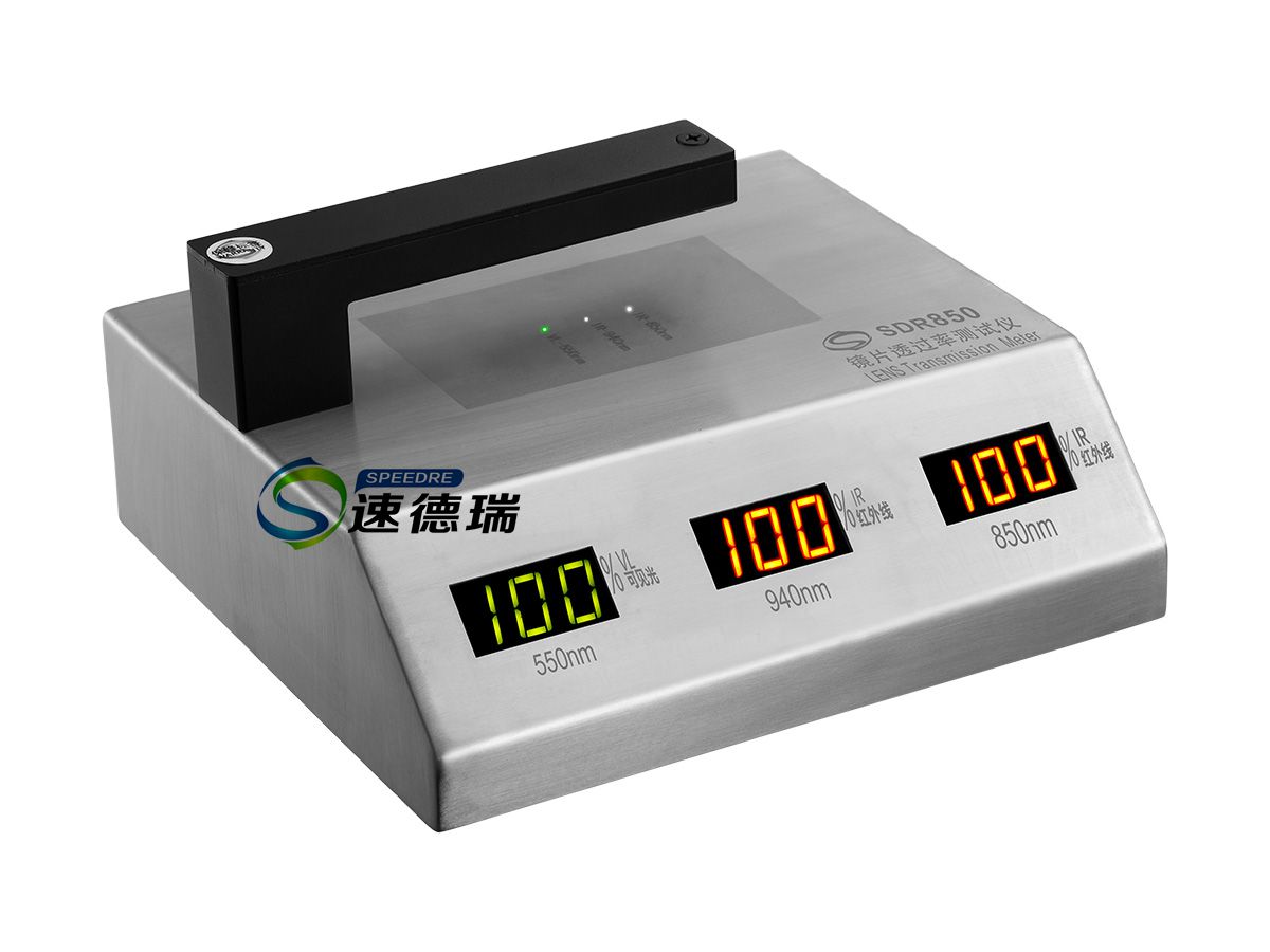 SDR850手機(jī)面板IR測(cè)試儀的測(cè)試原理是采用紅外850nm 光源,紅外940nm 光源和可見550nm 光源照射被測(cè)透明物質(zhì),感應(yīng)器分別探測(cè)三種光源的入射光強(qiáng)和透過被測(cè)透明物質(zhì)后的光強(qiáng),透過光強(qiáng)與入射光強(qiáng)的比值即為透過率,用百分?jǐn)?shù)表示