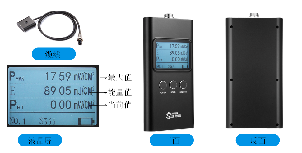 SDR365紫外輻照計由主機(jī)和感光探頭兩部分組成,二者通過纜線用航天插頭連接。主機(jī)上有電源開關(guān)和功能按鍵以及充電接口,通過充電接口可以給本機(jī)提供冗余供電。