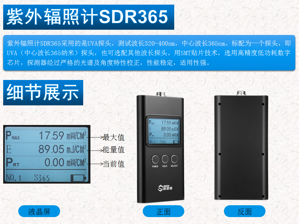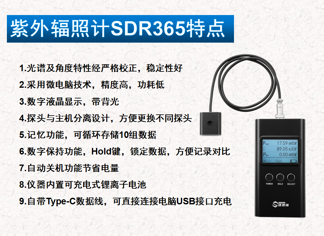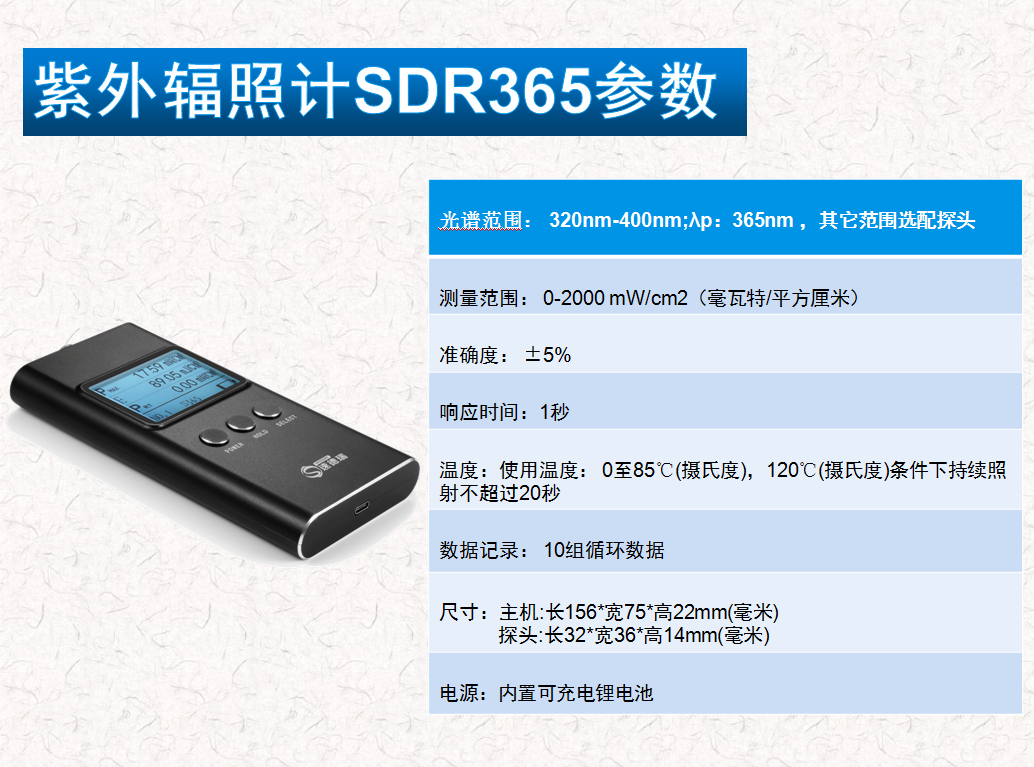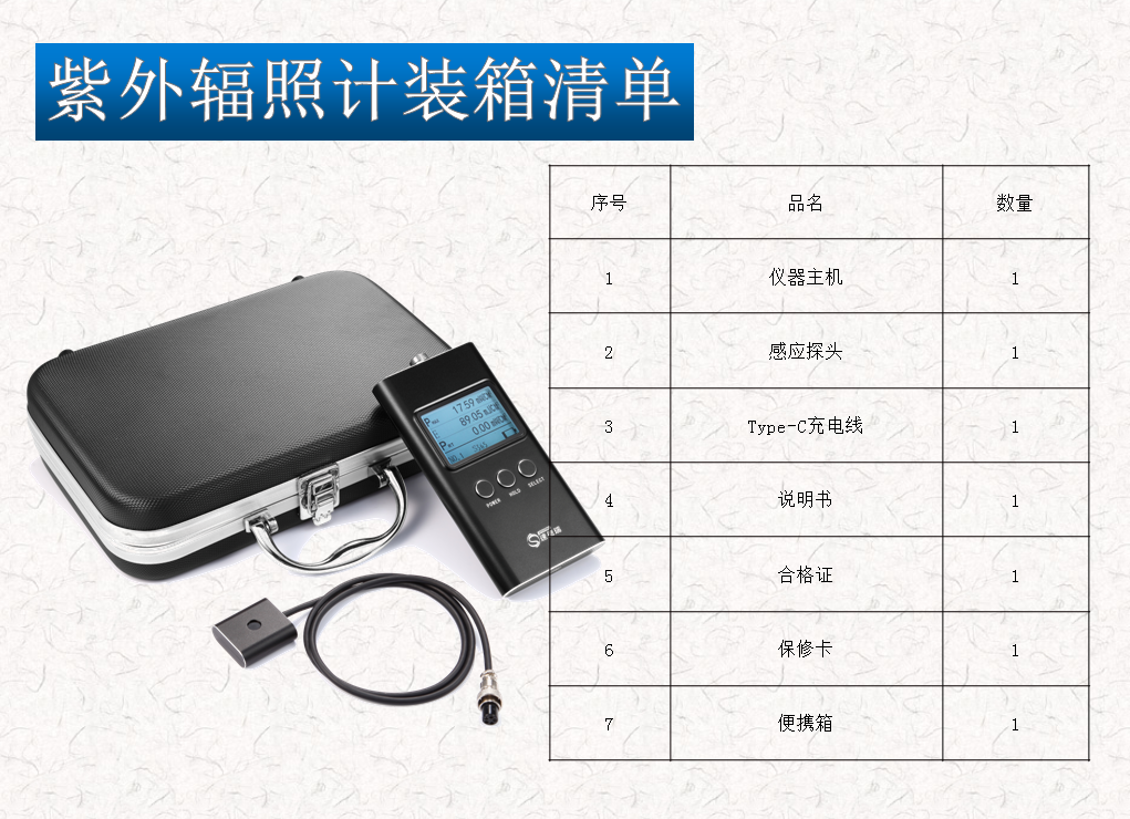 經(jīng)過我司研發(fā)團(tuán)隊(duì)的刻苦攻關(guān),順利研發(fā)出最新款的紫外輻照計(jì)。此紫外輻照計(jì),包含UV能量測試、UV輻照測試,并且可以保存10組測試結(jié)果,有Type-C接口連接充電。