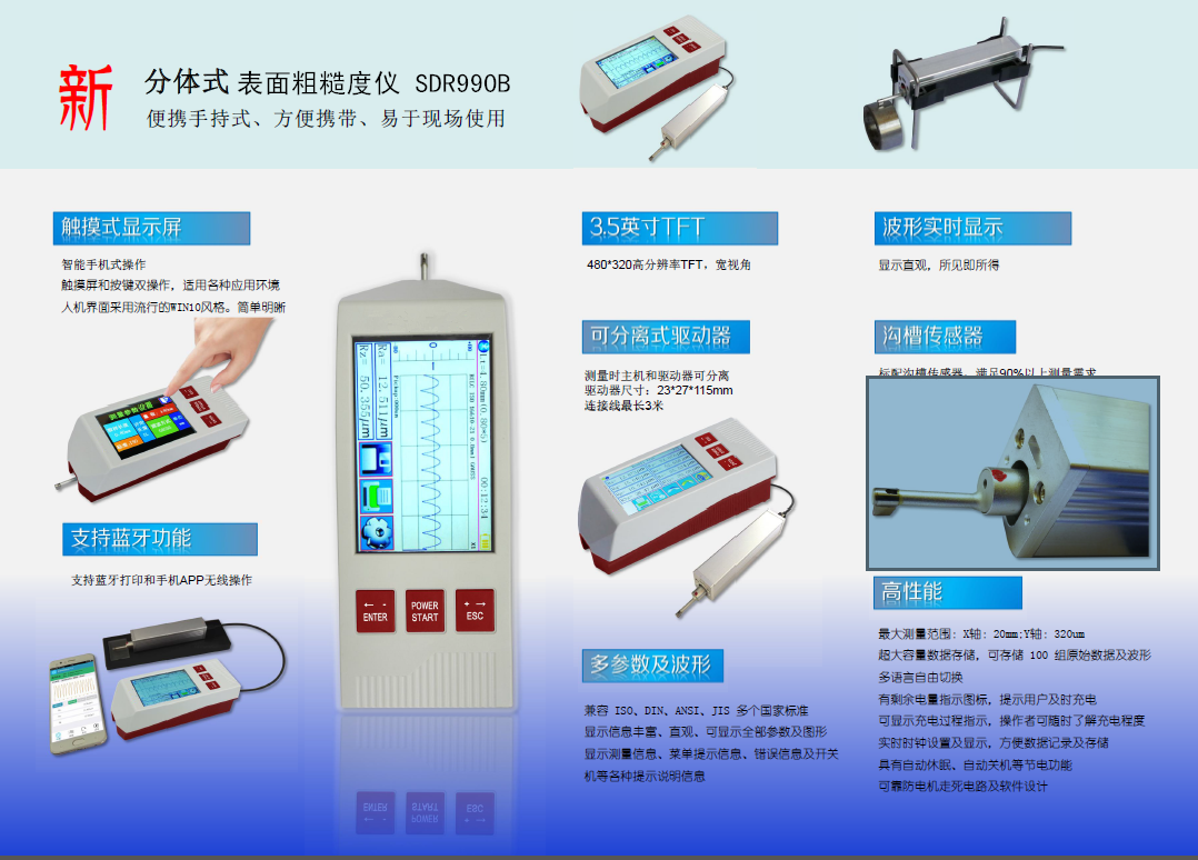 分體式表面粗糙度儀SDR990B是一種高精度表面粗糙度檢測儀器,可對多種機械加工零件表面的粗糙度進行測量,包括平面、斜面、外圓柱面,曲面,小孔,溝槽及車軸等。