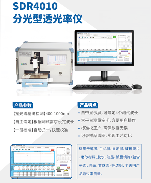 2. 分光透光率儀SDR4010,此款儀器適用于薄膜、手機(jī)屏、顯示屏、玻璃鏡片、磨砂材料、膠水、油墨、鍍膜鏡片(包含平面、球面、非球面)等透明、半透明產(chǎn)品透過率測量