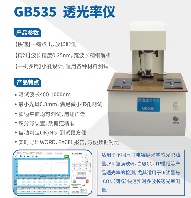 1. 弧邊透光率儀,此款儀器是針對電容屏光學(xué)感光IR油墨、AR 鍍膜玻璃、白玻CG、TP模組等產(chǎn)品透光率的檢測