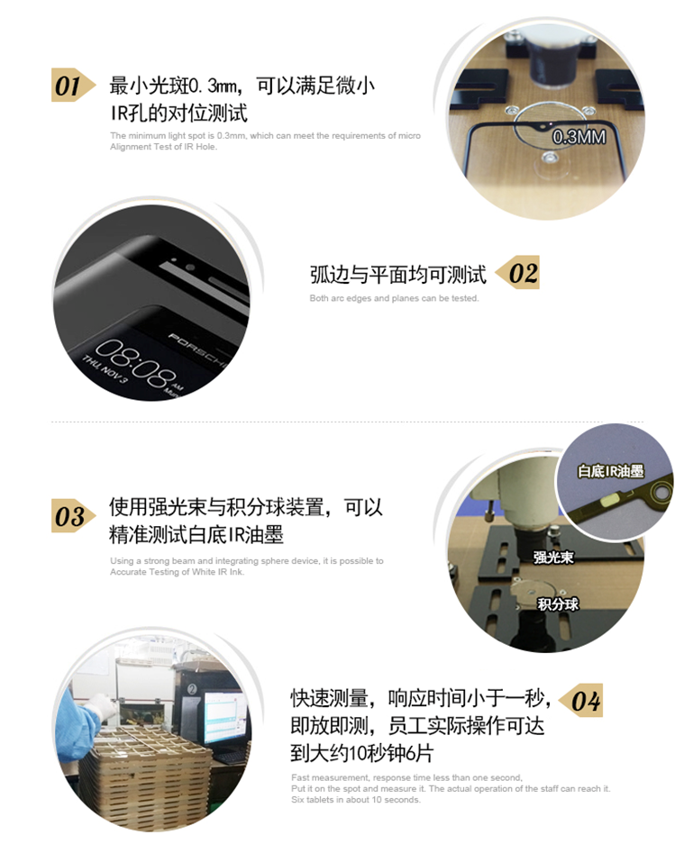 適用于不同尺寸電容屏光學(xué)感光IR油墨、AR 鍍膜玻璃、白玻CG、TP模組等產(chǎn)品透光率的檢測,尤其適用于IR油墨與ICON(圖標)快速實時多波長透光率測量。