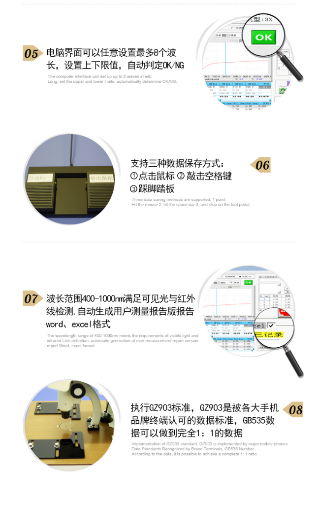 通訊方式 測量速度 數(shù)據(jù)保存 曲線對比 輸出報告 自動判斷結(jié)果 平臺尺寸 電腦同時顯示波長 | USB 全譜測量<1秒 有 有 有 有 300*250mm 8個波段 |