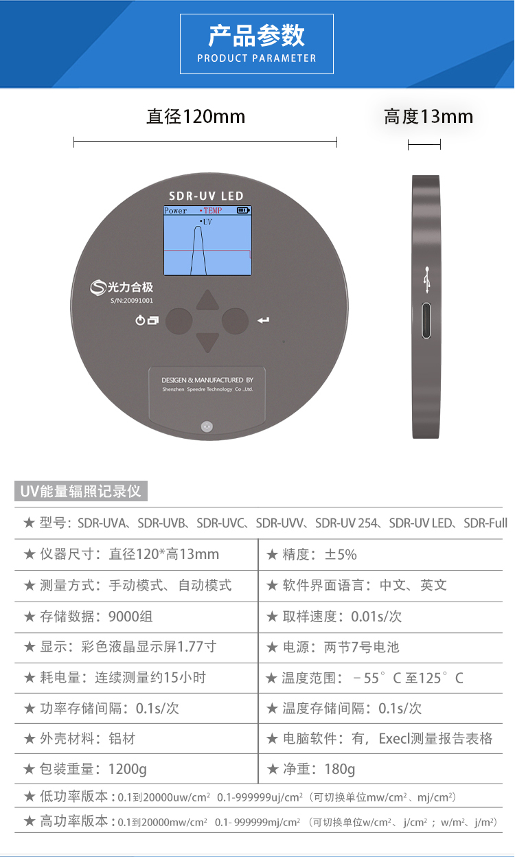 UV-SPEEDRE系列UV能量輻照記錄儀是一款高精度,高效率的UV能量輻射檢測(cè)儀器,主要適用于電子元件行業(yè),噴涂行業(yè),UV鍍膜行業(yè),印刷行業(yè)等各類需要用于測(cè)試高壓汞燈,低壓汞燈,氙燈,水銀燈、鹵素?zé)?、曬版燈、光清洗燈、光盤專用燈、紫外線鐵燈、殺菌消毒燈、短弧氙氣燈的光照強(qiáng)度和能量的檢測(cè)。