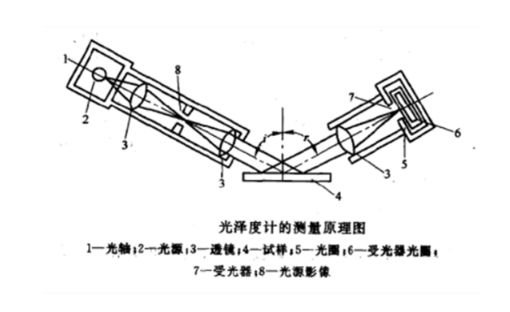 無(wú)機(jī)涂料光澤度通常以其干膜的鏡面光澤度來(lái)表示。所謂鏡面光澤度是指在規(guī)定的入射角下,試樣的鏡面反射率與同一條件下基準(zhǔn)面的鏡面反射率之比,用百分?jǐn)?shù)表示,一般省略百分號(hào),以光澤單位表示。根據(jù)入射光的角度不同,可分為20°、45°、60°、85°鏡面光澤。測(cè)量光澤度的儀器稱為光澤度計(jì),其原理如下圖所示: