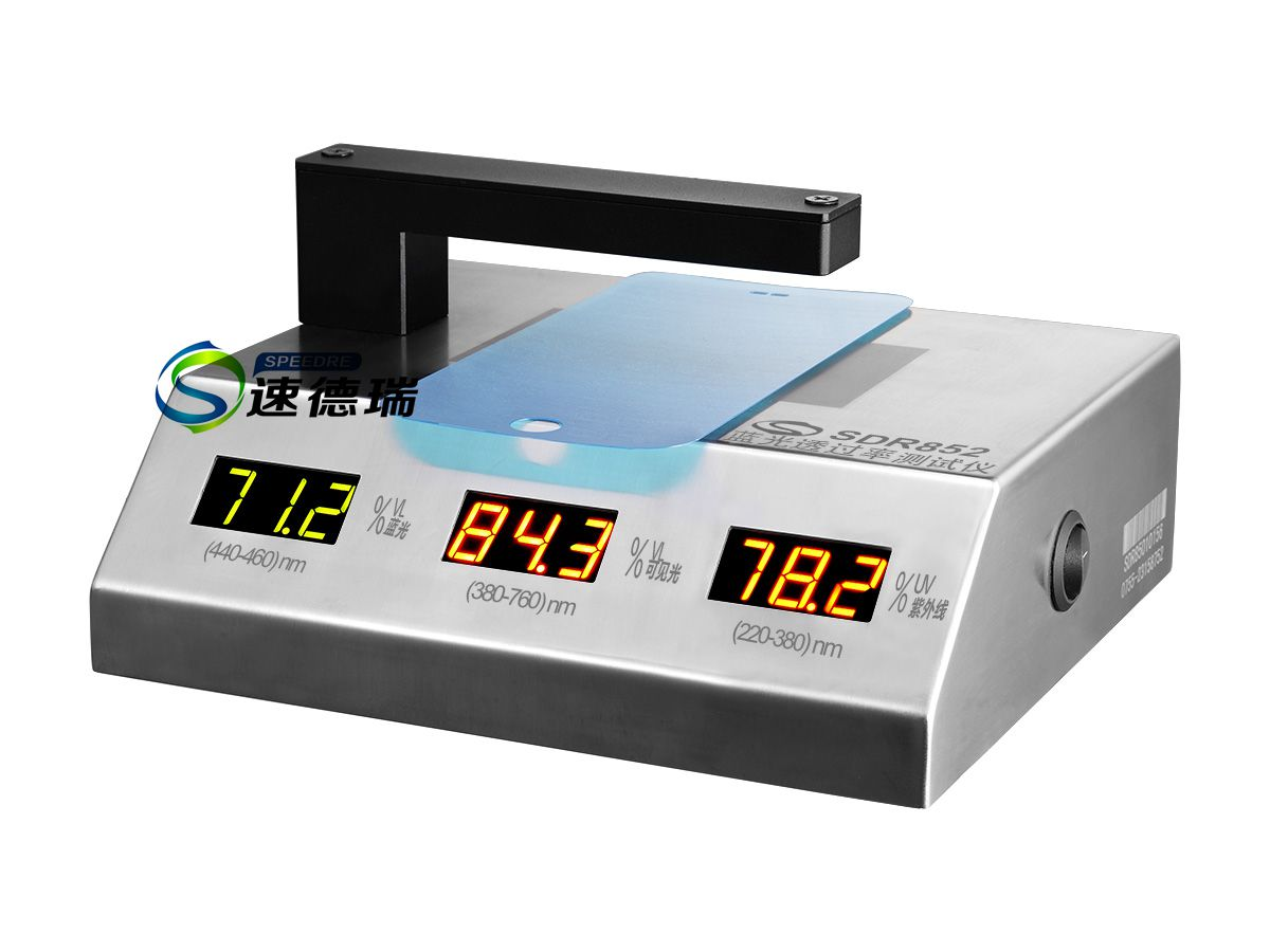 速德瑞SDR852藍光透過率測試儀的測試原理是采用可見光(藍光)450nm 光源,紫外線365nm 光源和可見光550nm 光源照射被測透明物質,感應器分別探測三種光源的入射光強和透過被測透明物質后的光強,透過光強與入射光強的比值即為透過率,用百分數(shù)表示。