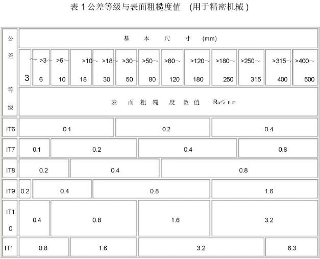 在機械零件設(shè)計工作中,按尺寸公差選擇表面粗糙度數(shù)值時,應(yīng)當(dāng)根據(jù)不同類型的機器,選擇相應(yīng)的表值。需要說明的是,表中Ra采用第1系列值,而舊的國標(biāo)Ra的極限值為第2 系列值,換算時會遇到數(shù)值上靠和下靠的問題。我們在表中表值采用上靠,因為這有利于提高產(chǎn)品質(zhì)量,個別值采用下靠。舊國標(biāo)的公差等級與表面粗糙度對應(yīng)的表的內(nèi)容和形式都比較復(fù)雜,對同一公差等級同一尺寸分段同一基本尺寸,孔與軸的表面粗糙度值不相同,不同配合種類數(shù)值也不相同,這是由于舊的公差與配合標(biāo)準(zhǔn)(GB159-59)的公差數(shù)值與上述因素有關(guān)。現(xiàn)行的新國標(biāo)公差與配合(GB1800-79)對同一公差等級同一尺寸分段內(nèi)各基本尺寸的標(biāo)準(zhǔn)公差值是相同的,這樣就使公差等級與表面租糙度的對應(yīng)表大為簡化,也更為科學(xué)合理。