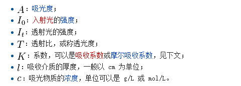 一束單色光照射于一吸收介質(zhì)表面,在通過(guò)一定厚度的介質(zhì)后,由于介質(zhì)吸收了一部分光能,透射光的強(qiáng)度就要減弱。吸收介質(zhì)的濃度愈大,介質(zhì)的厚度愈大,則光強(qiáng)度的減弱愈顯著,其關(guān)系為: