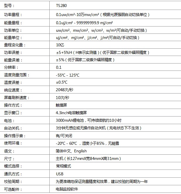 TS280觸摸屏紫外輻射照度計采用高清全觸摸屏設(shè)計,操作更簡單;即使是弱光也能快速讀取,精度更高;量程可自動識別切換,真正實現(xiàn)從弱光到強光一機式測試,儀器操作更加簡單快捷??焖?、準(zhǔn)確地測量出不同光源強度下的光固化、光刻、光照治療、殺菌消毒、理療熒光分析、植物栽培、水處理、氣象和農(nóng)業(yè)生產(chǎn)紫外線光源等各行業(yè)的紫外線輻照度。