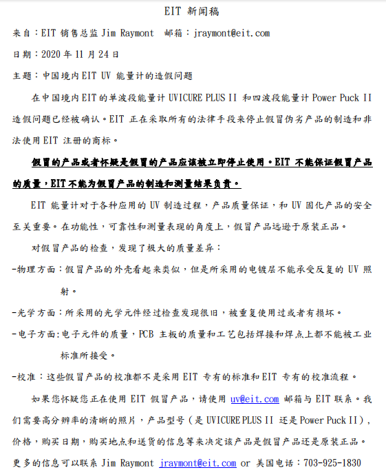 早在2020年美國官網www.eit.com就發(fā)布通知,中國大量造假,在造假暴利面前,國內市場上成交的EIT能量計正品占比不足20%。以下為美國EIT在2020年出的通知: