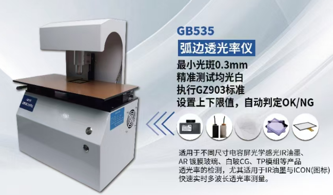 全面屏?xí)r代,屏占比越來越大,致使光線感應(yīng)孔,距離感應(yīng)孔,人臉識別感應(yīng)孔被迫到邊緣,甚至與弧邊重合。對 IR 的檢測就產(chǎn)生了新的困難,速德瑞GB535 是 專業(yè)的弧邊透光率解決方案設(shè)備。 GB535弧邊透光率儀測量光斑0.3mm,測試波長400-1000nm,適用于不同尺寸電容屏光學(xué)感光 IR 油墨、AR 鍍膜玻璃、白玻 CG、TP 模組等產(chǎn)品透光率的檢測,尤其適用于 IR 油墨與 ICON(圖標(biāo))快速實(shí)時多波長透光率測量,解決了全面屏微孔、弧邊、人臉識別白底IR等難題。