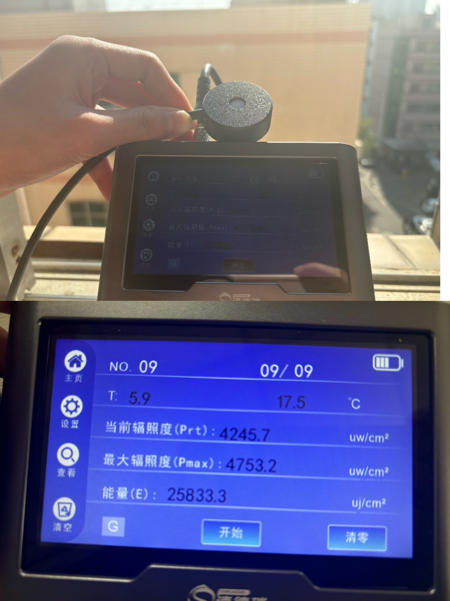 UVA波長(zhǎng)更長(zhǎng),約為320~400nm,穿透力強(qiáng),可以到達(dá)真皮層,導(dǎo)致皮膚老化、皺紋、曬黑等現(xiàn)象。雖然UVA在冬季的強(qiáng)度相對(duì)較低,但全年都存在,且長(zhǎng)時(shí)間暴露仍然可能對(duì)皮膚造成傷害。我用速德瑞的觸摸屏紫外輻照計(jì)分別在上午10:00和下午14:00以及17:00做了紫外線強(qiáng)度的測(cè)試,如下圖: