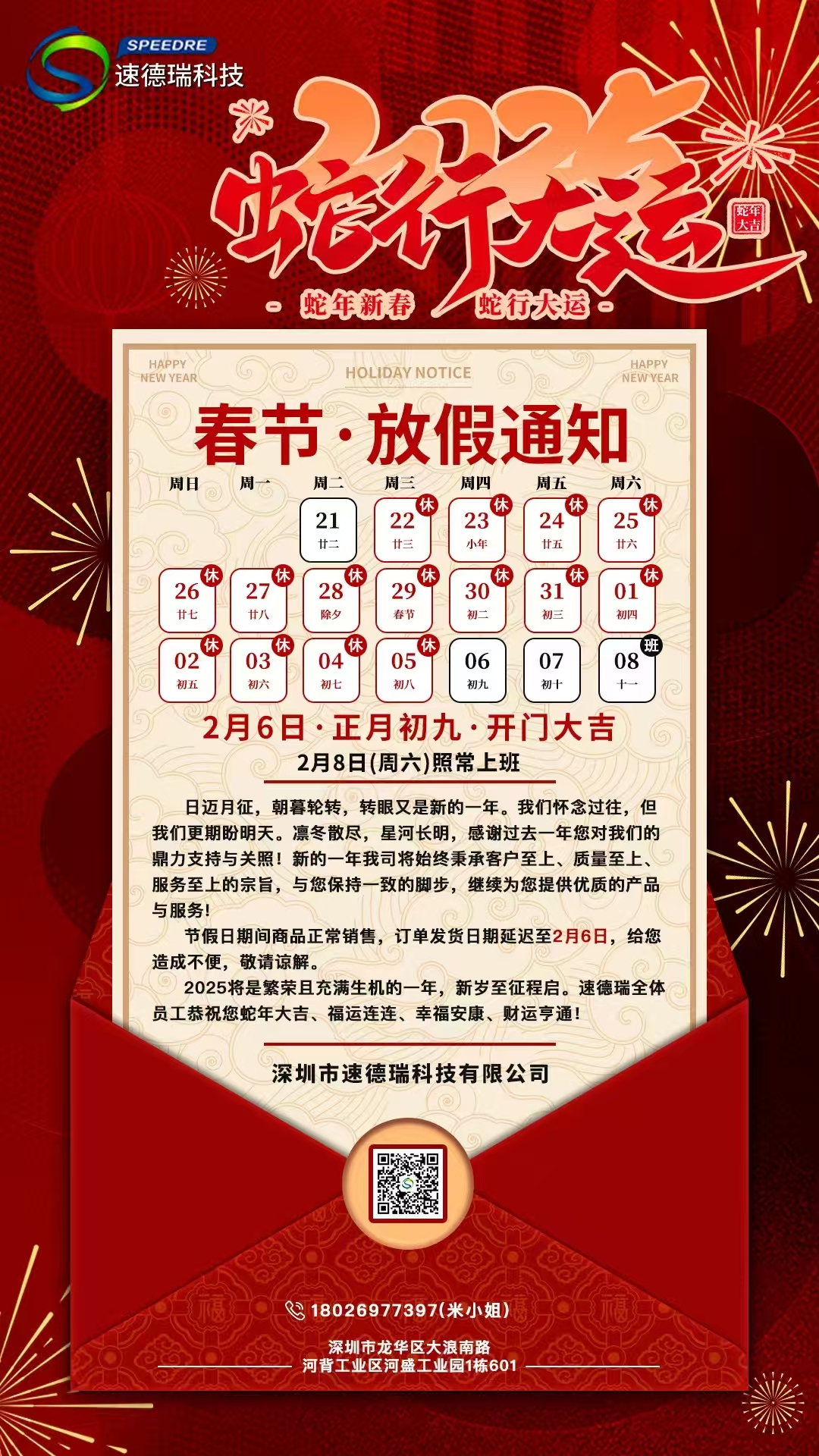 春節(jié)假期到來(lái)啦!辭舊迎新,蛇年新氣象!感謝每一位客戶的支持與信任,愿大家財(cái)運(yùn)亨通,步步高升!我司春節(jié)放假安排如下: