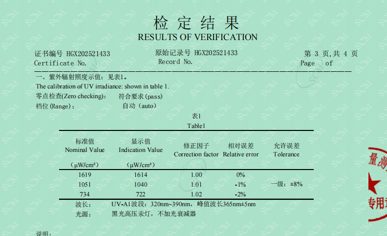 2.核心數(shù)據(jù)表:這部分通常是個表格,列明了在不同紫外強度標準值下,被檢儀器的顯示值以及計算出的誤差。